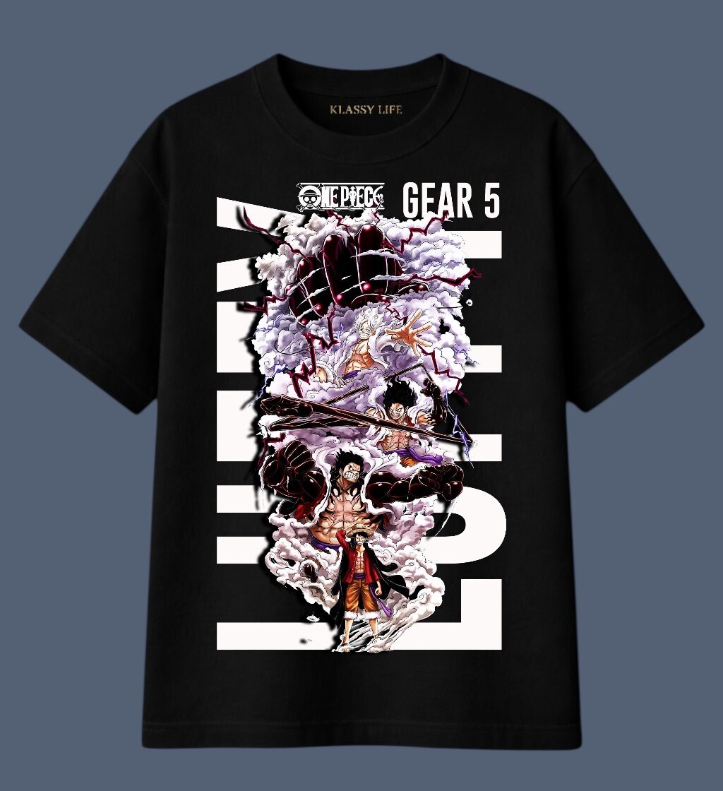 Epic One Piece “Gear 5” oversized tee. Soft cotton, bold design, and the perfect fit for anime lovers.